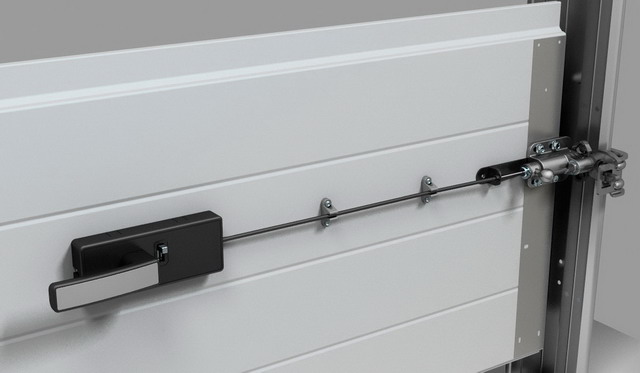 Стандартный комплект промышленных ворот всех видов включает пружинный засов, который позволяет запирать ворота изнутри помещения. Засов используется только при наличии дополнительного входа в помещение.