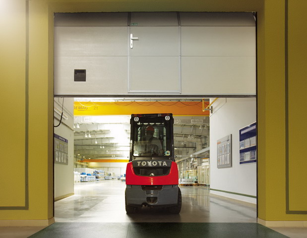 Секционные ворота применяются для широкого круга промышленных объектов: пожарные части, станции технического обслуживания, автомойки, подземные гаражи, паркинги и т. д. Свое название ворота получили благодаря конструкции: они состоят из горизонтальных секций (сэндвич-панелей), соединенных между собой промежуточными петлями.